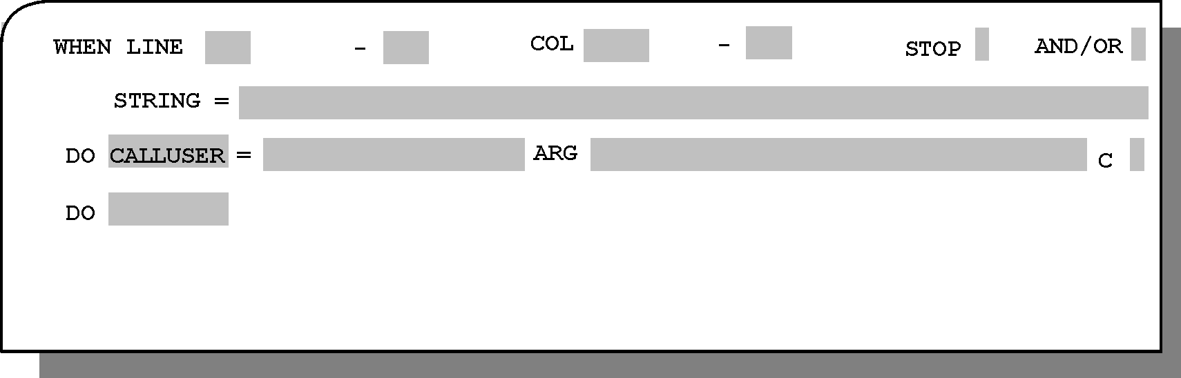 Optional. Type the word CALLUSER (or its abbreviation CA) next to the DO in the Rule Definition screen. When Enter is pressed, the = prompt and the following fields are displayed: