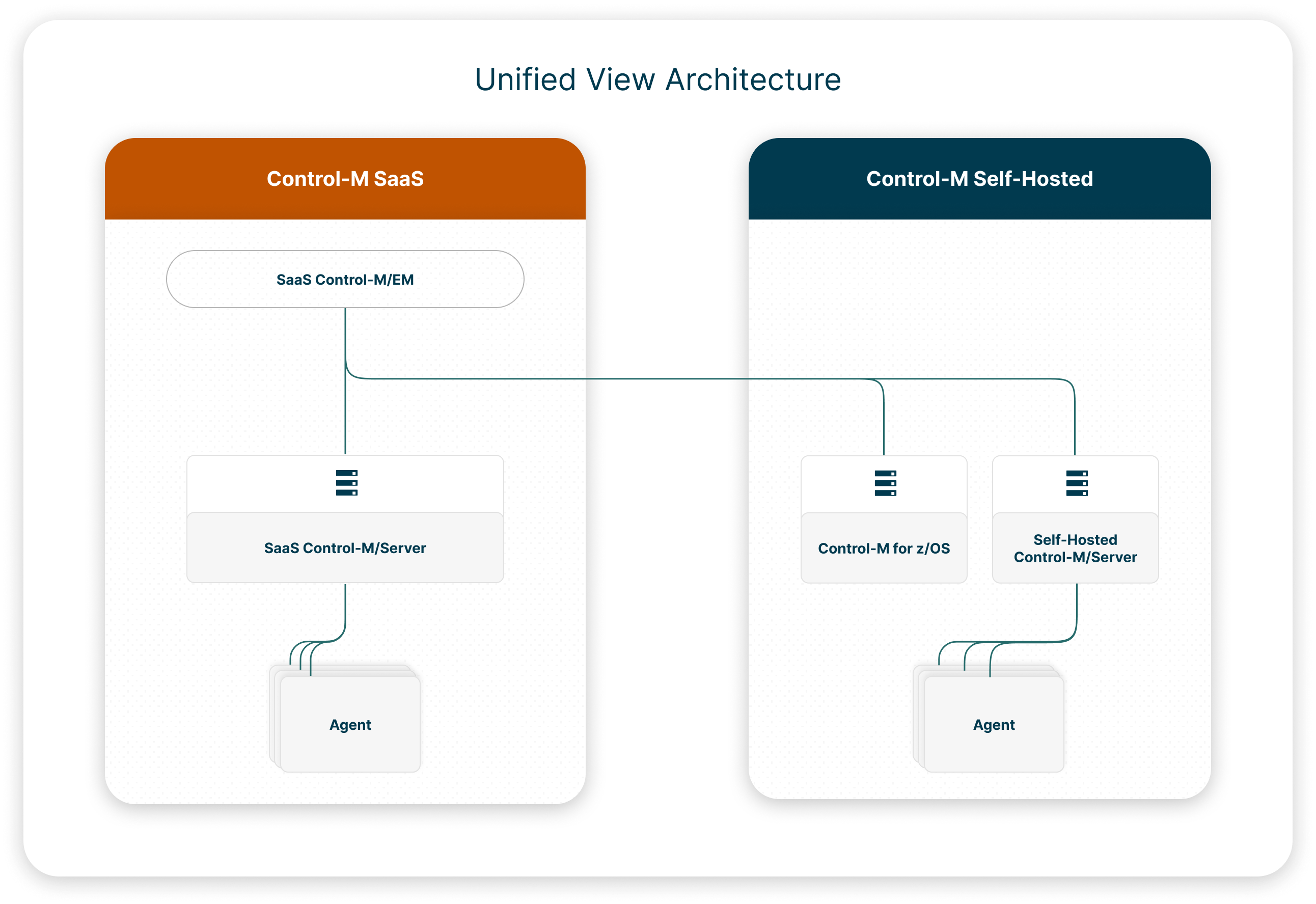 Unified View is a hybrid mode of Control-M SaaS that enables you to combine the functionality of Control-M SaaS and Self-Hosted and view and manage self-hosted Control-M/Servers. Control-M SaaS Unified View eliminates the need to maintain a self-hosted Control-M/EM and its database.