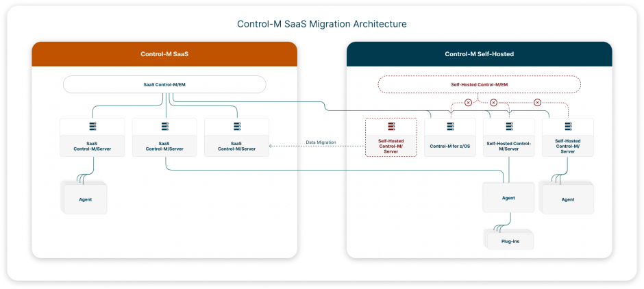 The Control-M SaaS migration copies the data from a self-hostedClosed An Control-M environment (Control-M Self-Hosted), or specific Control-M component that you install and manage on your own infrastructure. Control-M/EM to a SaaS Control-M/EM and enables you to migrate some or all of your self-hosted Control-M components to Control-M SaaS. This eliminates the need to maintain a self-hosted Control-M/EM, one or more self-hosted Control-M/Servers, and the databases for all migrated components. If you have Control-M for z/OS environments or Control-M/Servers that cannot be migrated, you can instead connect these components to Control-M SaaS Unified ViewClosed A mode of Control-M SaaS that enables you to connect self-hosted Control-M/Servers and Control-M for z/OS environments to a SaaS Control-M/EM and run jobs that are connected to these self-hosted components from Control-M SaaS..